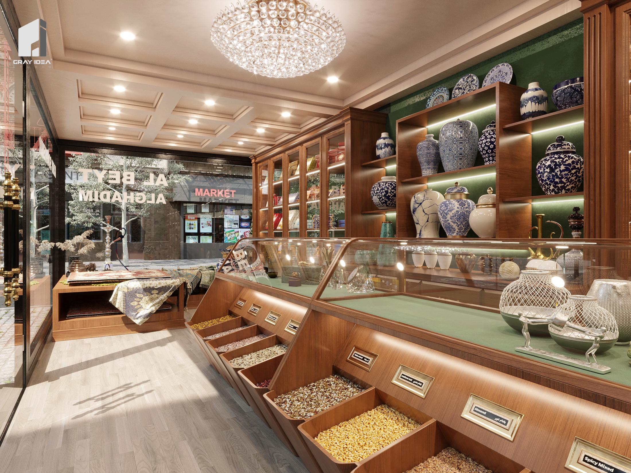 کانسپت طراحی بر پایهی ایجاد حجمی شیشهای از دو طرف شکل گرفت تا بیشترین شفافیت بصری و ارتباط با محیط پیرامون فراهم شود. در داخل فضا، قفسهبندی منظم برای نمایش محصولات و استفاده از رنگها و المانهای الهامگرفته از فرهنگ و هنر ایرانی، هویت بصری منحصربهفردی به پروژه بخشید.