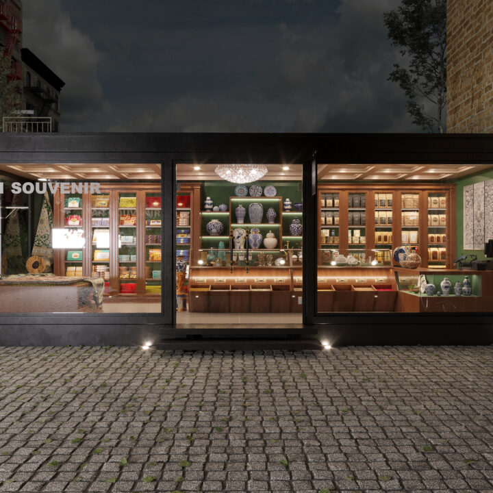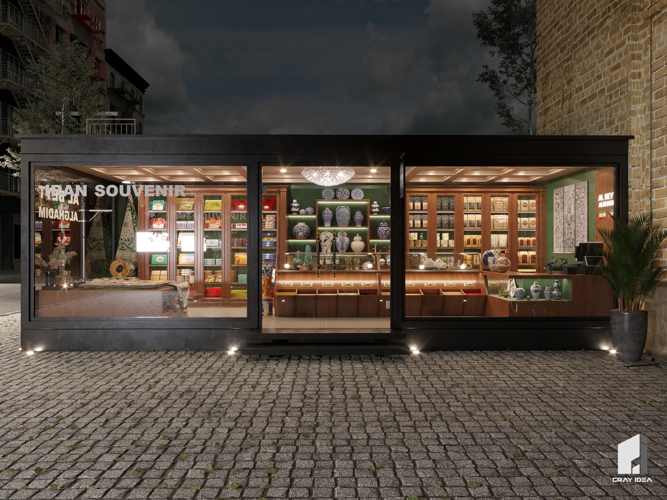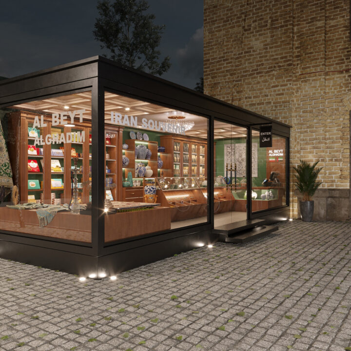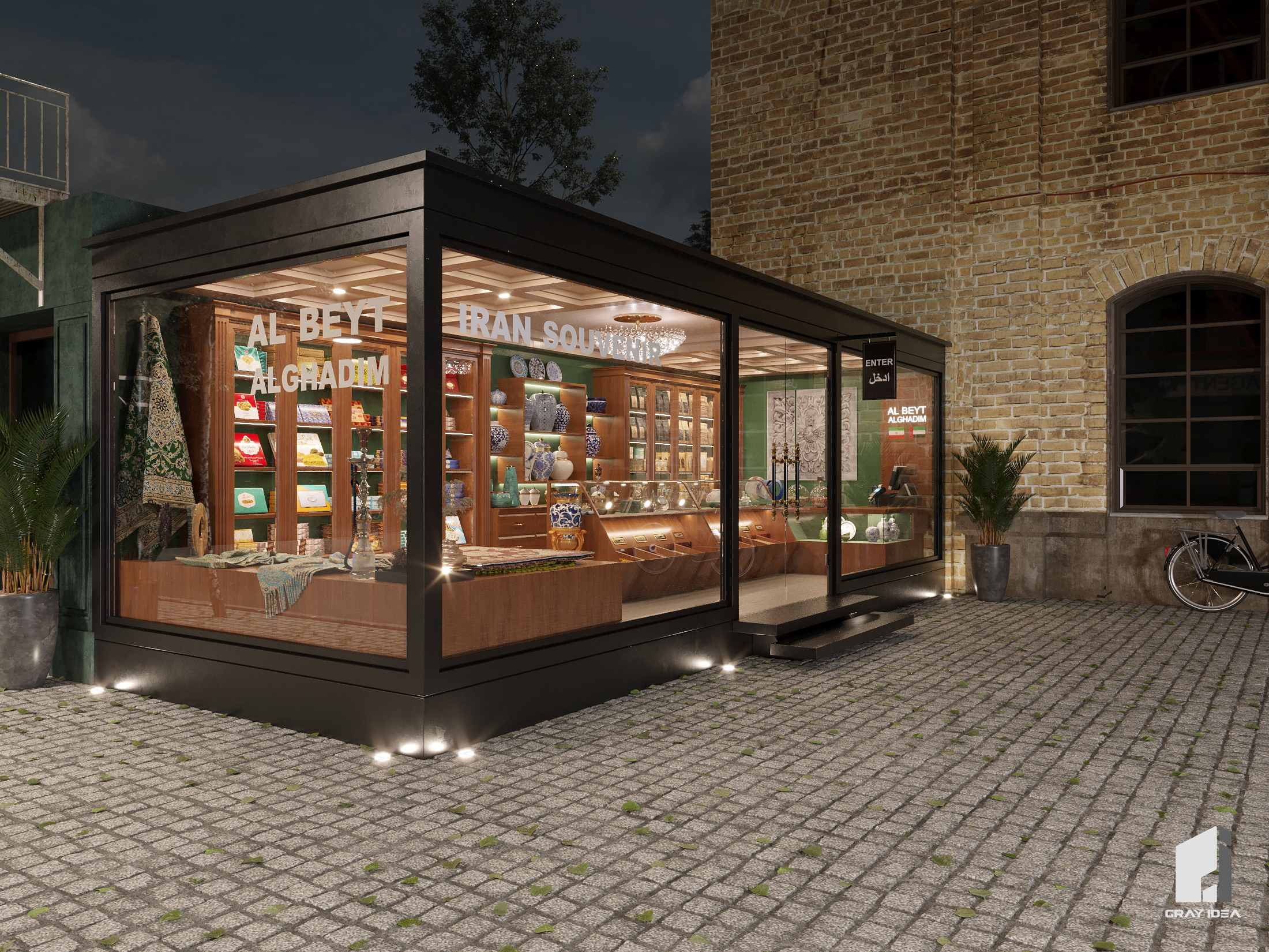 این پروژه از جمله کارهای متفاوت دفتر ما به شمار میرود. طراحی غرفهای فروشگاهی با کاربری دائمی و مساحتی حدود ۳۰ متر مربع در فضای شهری دبی، با هدف عرضهی سوغات و صنایعدستی ایران انجام شد.