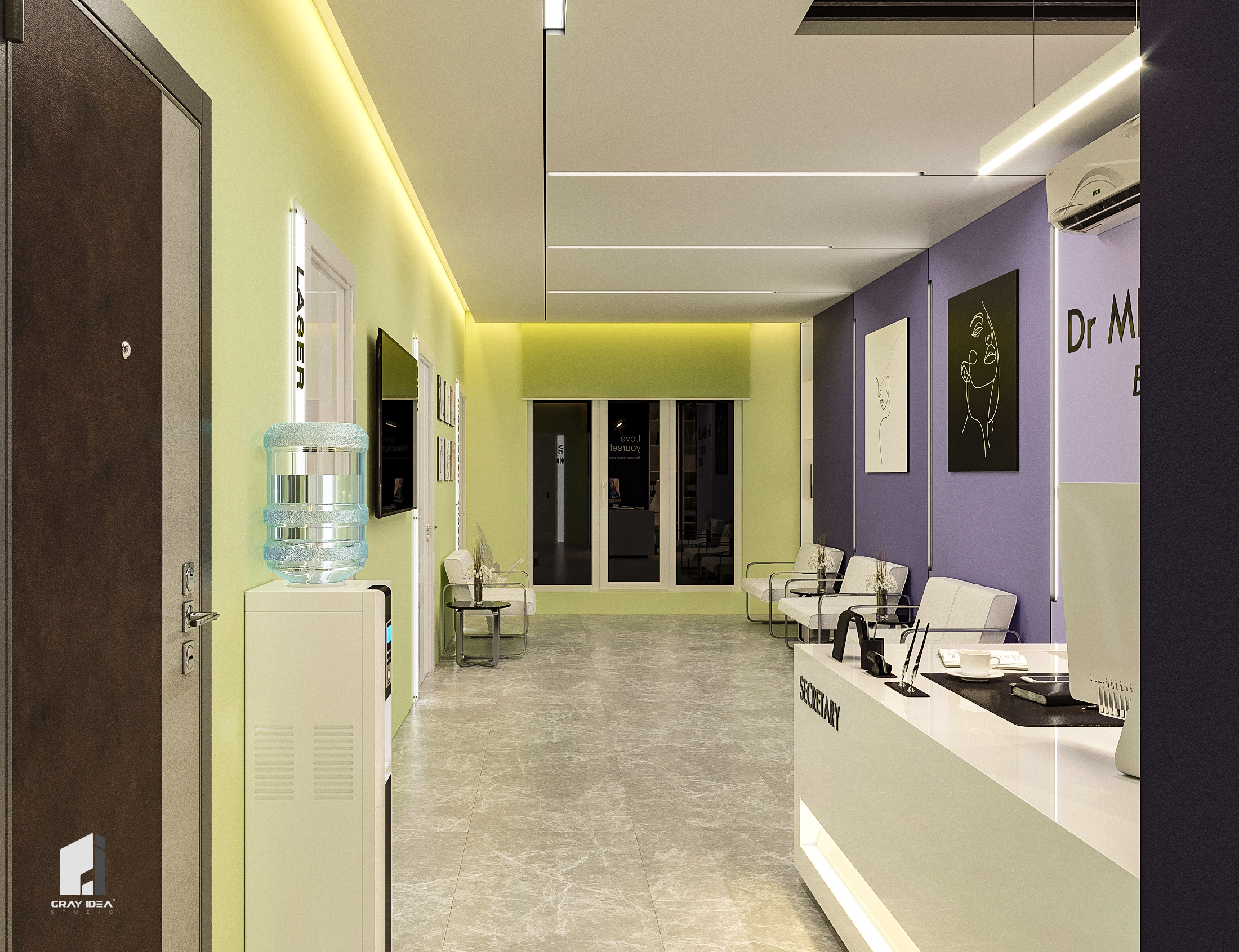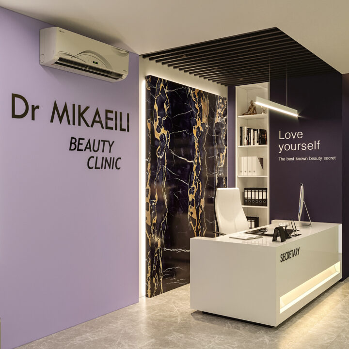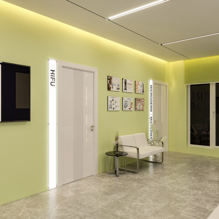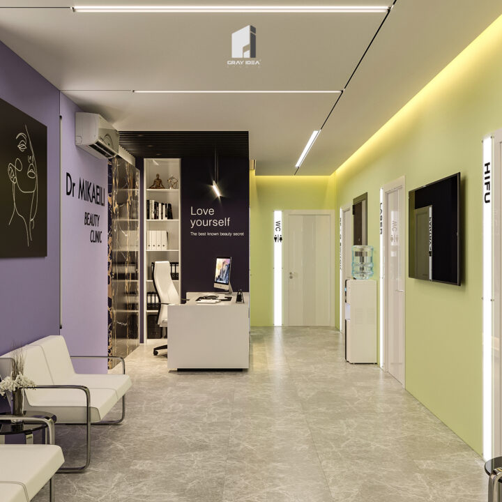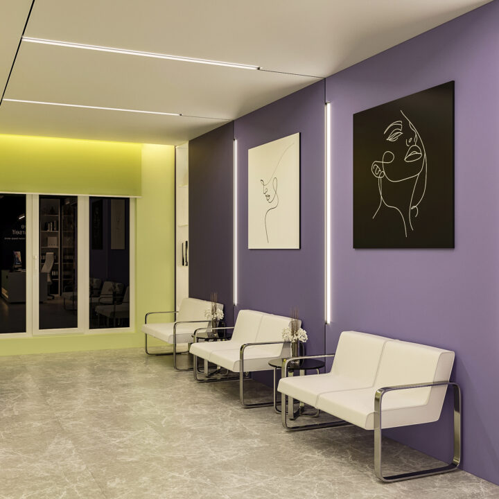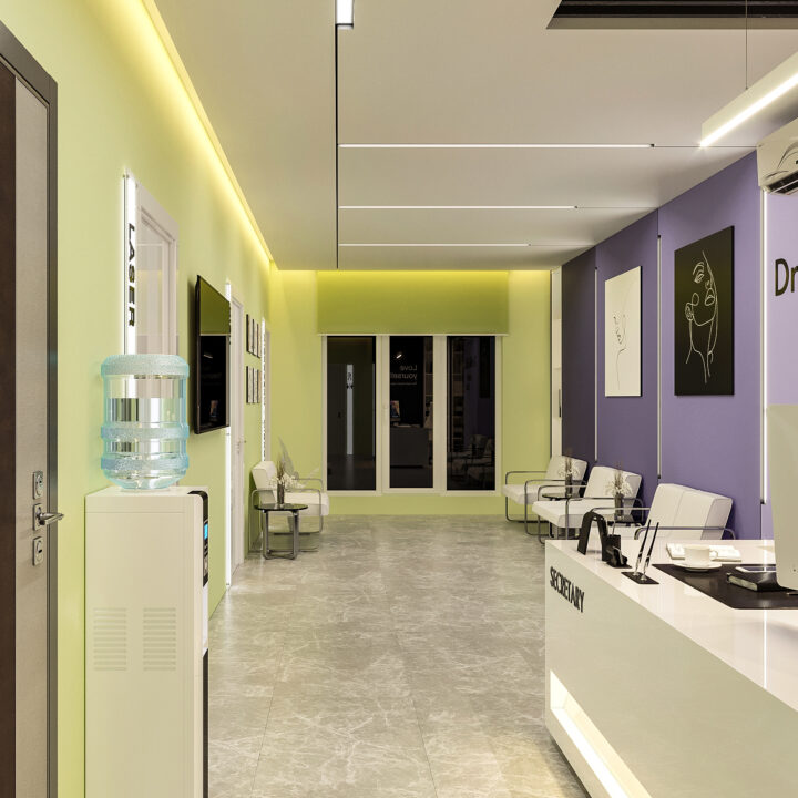 در طراحی این کلینیک زیبایی، ایجاد فضایی درمانی در عین حال زیبا و دلپذیر، بدون القای حس بیماری و انرژی منفی به مراجعین، از اهداف اصلی بود. با استفاده از المان‌های مدرن و ترکیب رنگ‌های بنفش در طیف‌های مختلف و لیمویی کمرنگ، محیطی آرام، امن و جذاب شکل گرفت. همچنین، با دقت در تفکیک فضاها و دسترسی‌ها، پلان به گونه‌ای طراحی شد که عملکرد بهینه و تجربه‌ای مطلوب را برای مراجعین فراهم کند.