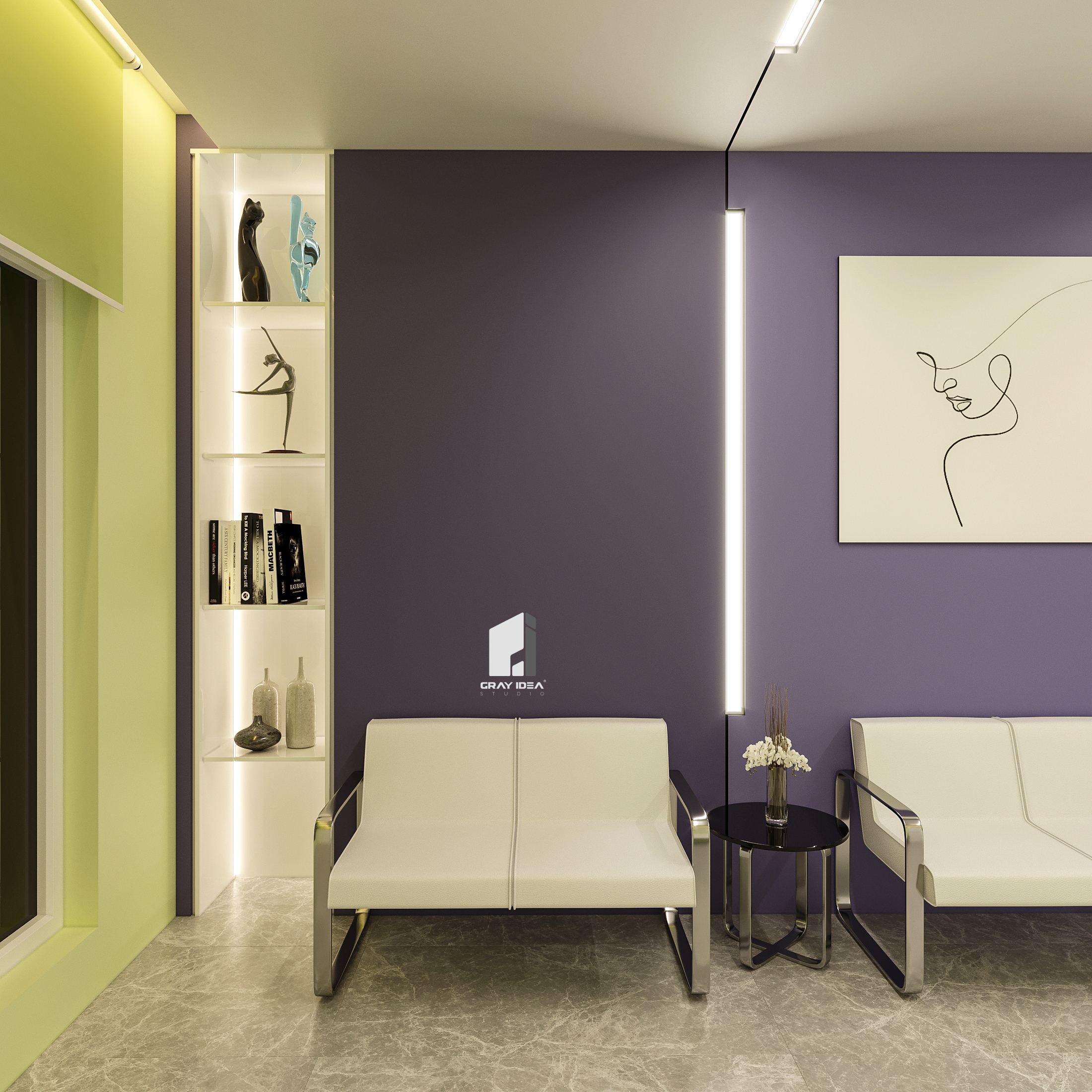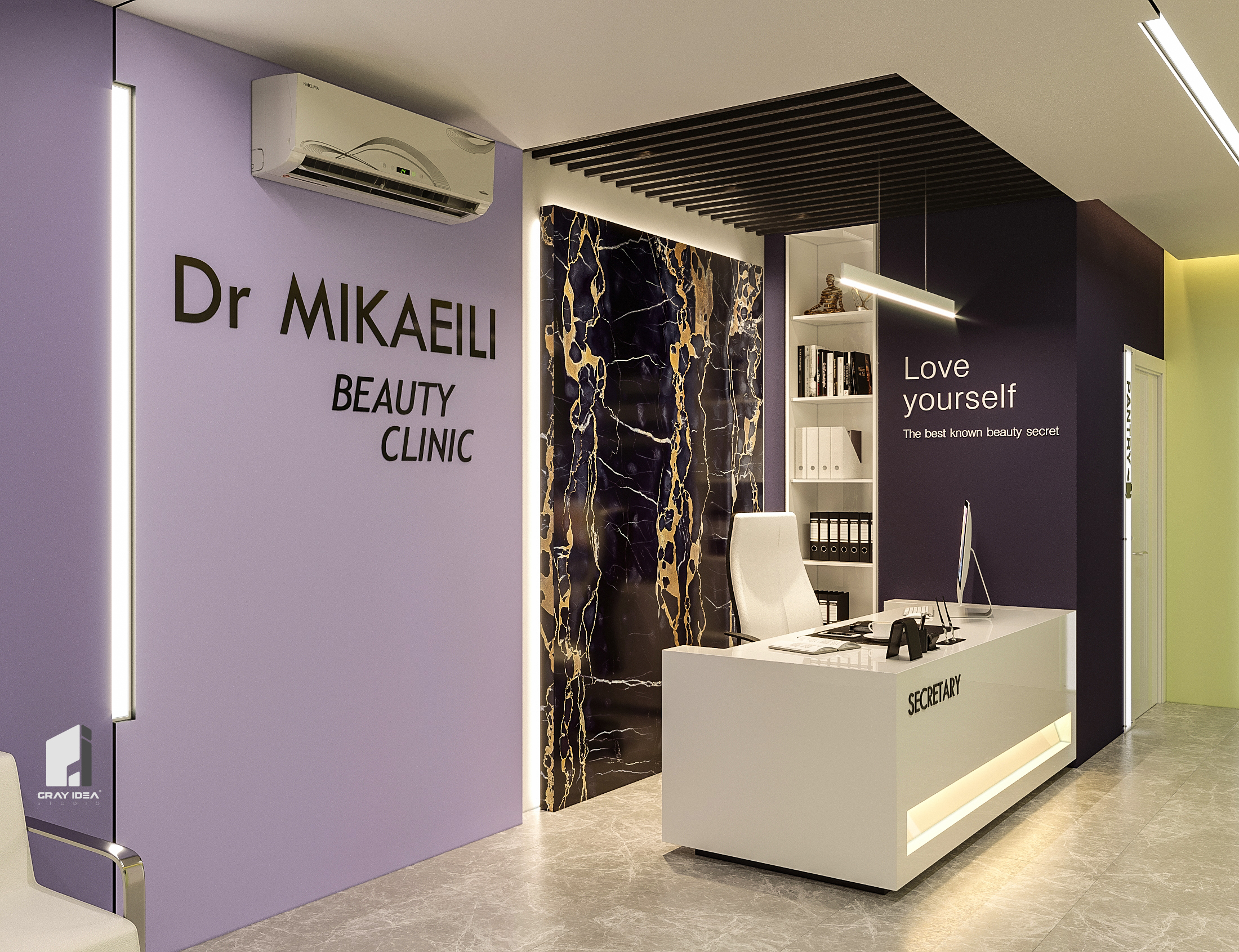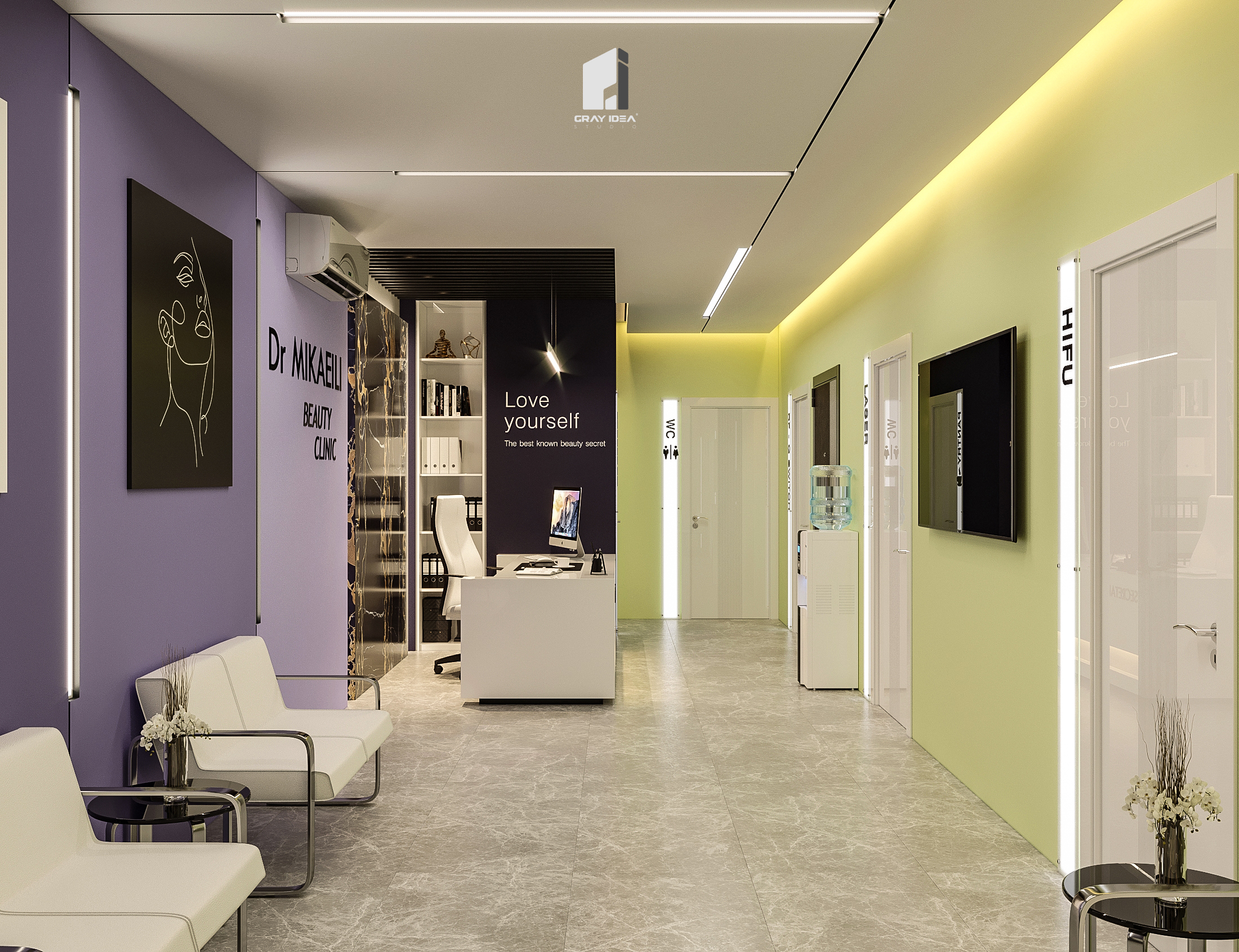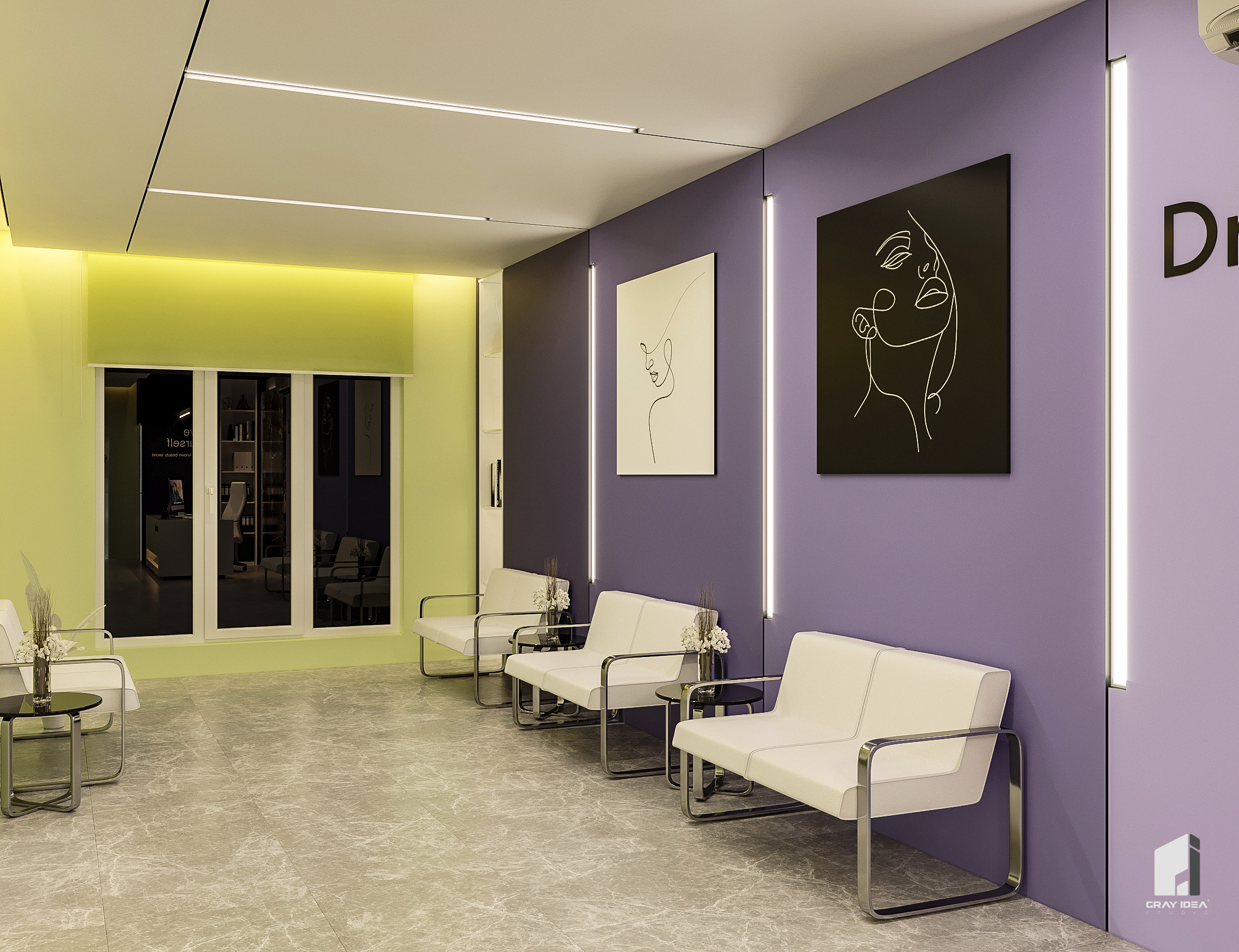 در طراحی این کلینیک زیبایی، ایجاد فضایی درمانی در عین حال زیبا و دلپذیر، بدون القای حس بیماری و انرژی منفی به مراجعین، از اهداف اصلی بود. با استفاده از المان‌های مدرن و ترکیب رنگ‌های بنفش در طیف‌های مختلف و لیمویی کمرنگ، محیطی آرام، امن و جذاب شکل گرفت. همچنین، با دقت در تفکیک فضاها و دسترسی‌ها، پلان به گونه‌ای طراحی شد که عملکرد بهینه و تجربه‌ای مطلوب را برای مراجعین فراهم کند.