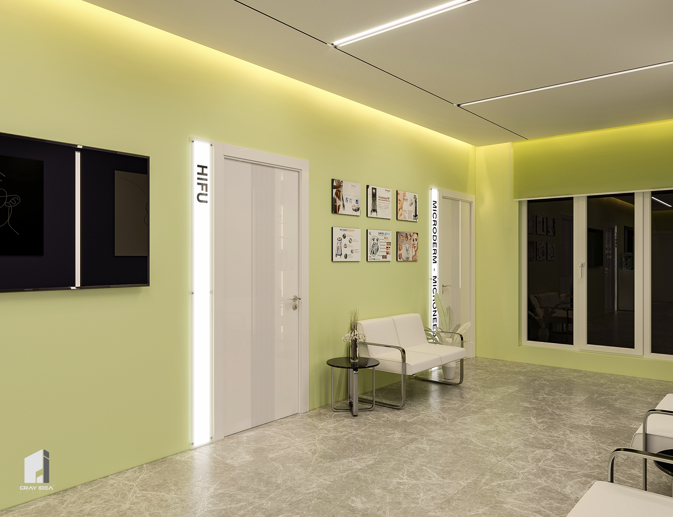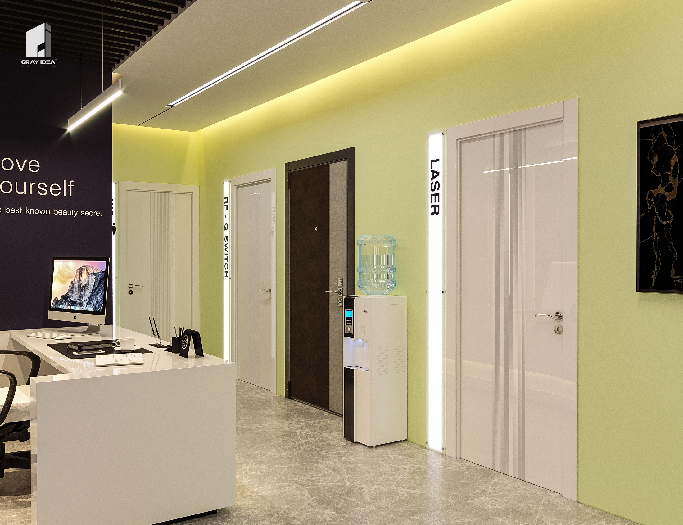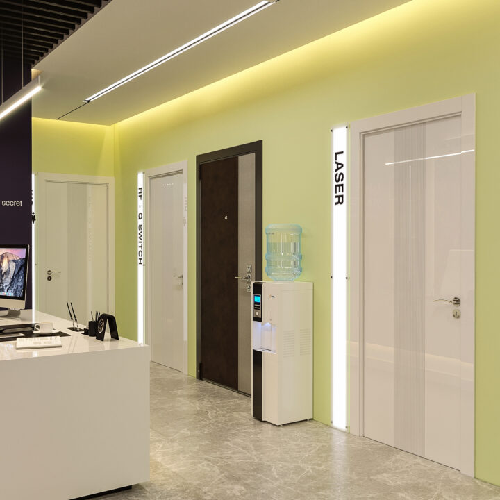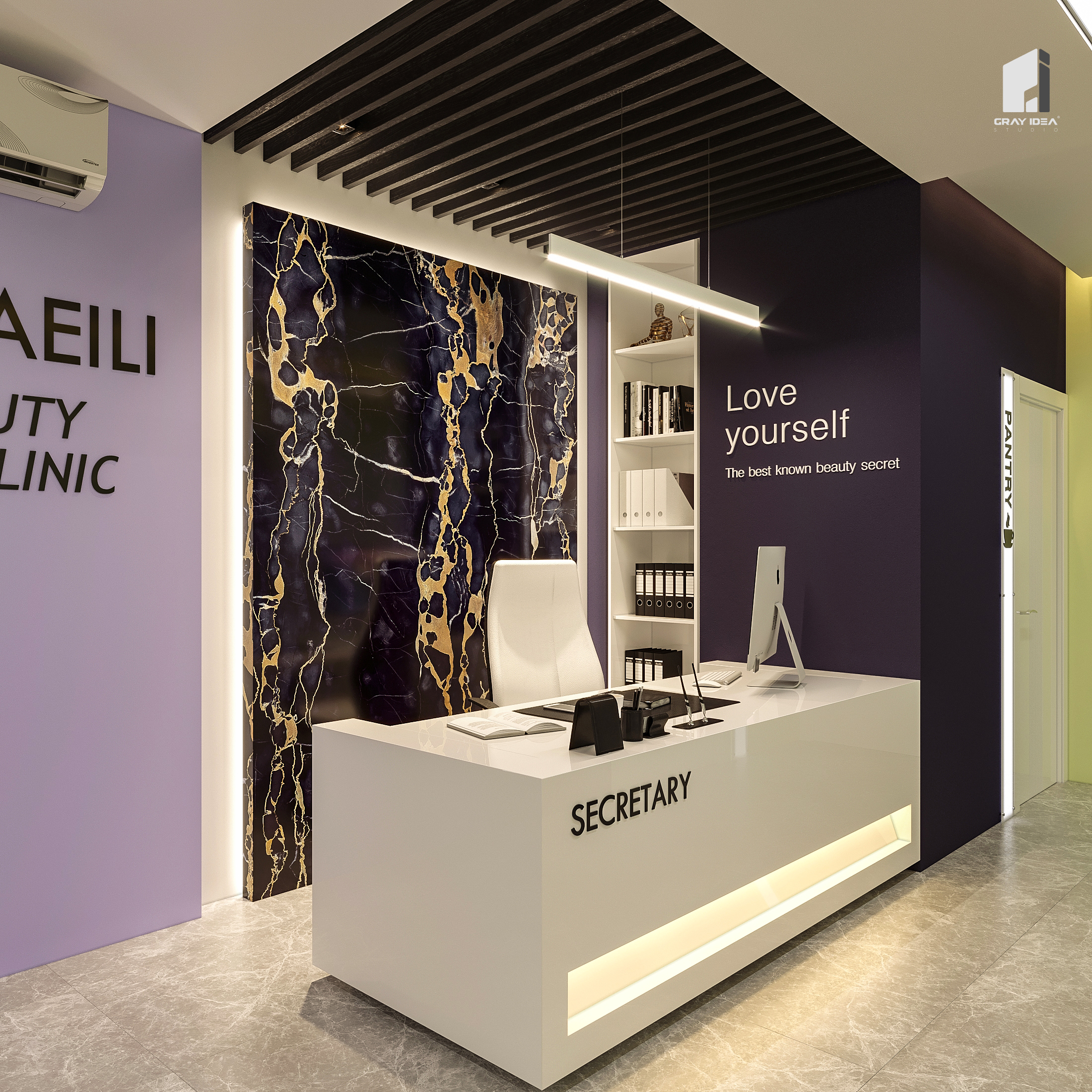 در طراحی این کلینیک زیبایی، ایجاد فضایی درمانی در عین حال زیبا و دلپذیر، بدون القای حس بیماری و انرژی منفی به مراجعین، از اهداف اصلی بود. با استفاده از المان‌های مدرن و ترکیب رنگ‌های بنفش در طیف‌های مختلف و لیمویی کمرنگ، محیطی آرام، امن و جذاب شکل گرفت. همچنین، با دقت در تفکیک فضاها و دسترسی‌ها، پلان به گونه‌ای طراحی شد که عملکرد بهینه و تجربه‌ای مطلوب را برای مراجعین فراهم کند.